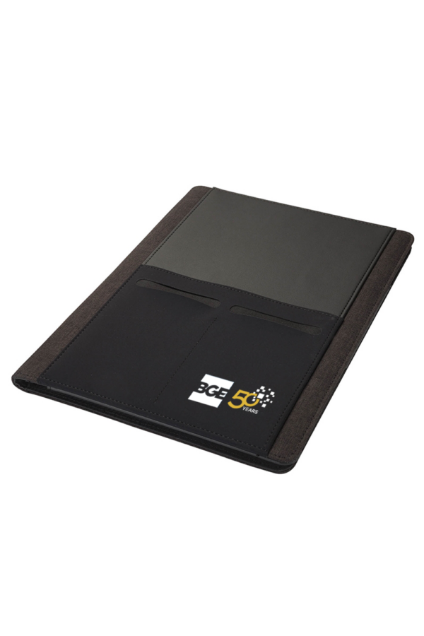 The Letter Size Tech & Conference Padfolio is the perfect companion for any professional. With a stylish heathered black cover and soft leatherette inlay, it features multiple expandable pockets for notes, schedules, your smartphone, and pens. Inside, additional pockets provide space for business cards and papers. An elastic pen loop and a 30-page replaceable pad with college-ruled lines are included. Stay organized and prepared with this sleek, all-in-one padfolio.